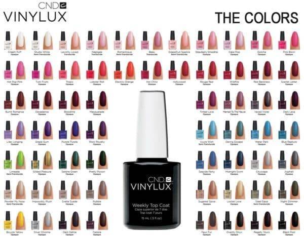 На данный момент палитра цветов Vinylux состоит из более чем 130 оттенков. Все они являются результатом работы производителя CND с ведущими мировыми модельерами. Мастера компании в течении более десяти лет принимают участие во всевозможных модных показах и престижнейших дефиле США, Италии и Австралии. Поэтому цветовые решения лаков Vinylux не только самые популярные, но и самые модные.