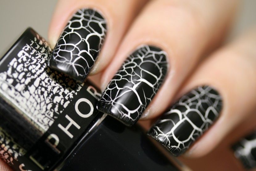 . Контрастные цвета создают яркий эффект и подчеркивают глубину трещинок верхнего слоя. - Черный или белый лаки с эффектом кракелюра
