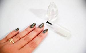 - После просушки ногтей надо снять с ногтей липкий слой. Для этого применяются специальные вещества или спиртосодержащий раствор.