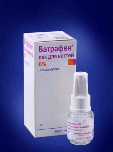 - Батрафен – эффективный лак для лечения 58 видов грибов, провоцирующих развитие микоза на ногтях рук и ног. Его активный компонент – Циклопирокс. Схема терапии рассчитана на 3 месяца. 1-ый месяца средство наносится на поражённые ногти через день, 2-ой месяц – дважды в неделю, 3-ий месяц – раз в неделю. Максимальная длительность терапии – 6 месяцев. Противопоказания – возраст до 10 лет, гиперчувствительность к компонентам, беременность, лактация. Побочные эффекты – крапивницы, зуд, шелушение. Стоимость – от 2200 руб. Подробнее о лаке Батрафен