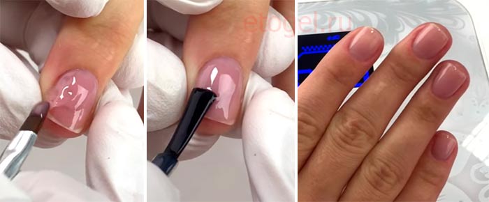 Нанесение специального геля. После подготовки ногтей, на их поверхность наносится специальный гель, который содержит активные вещества для укрепления и питания ногтей. Гель наносится в несколько слоев с промежуточной сушкой.