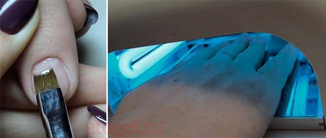 - После нанесения каждый ноготь подсушивают в УФ-лампе.