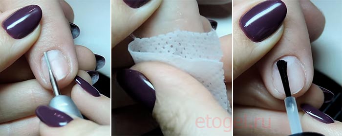 Подготовка ногтей. Перед началом процедуры необходимо сделать дезинфекцию рук и ногтей. Затем ногтевую пластину нужно очистить от остатков лака и кожицы. Также проводится полировка ногтевой пластины.