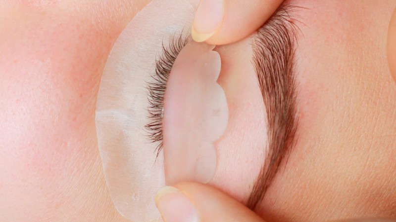 - После нижние ресницы разбирают на волоски и аккуратно разделяют их при помощи гидрогелиевого патча, а после сдвигают и верхнее веко таким образом, чтобы ресницы лежали разложенными и на виду;