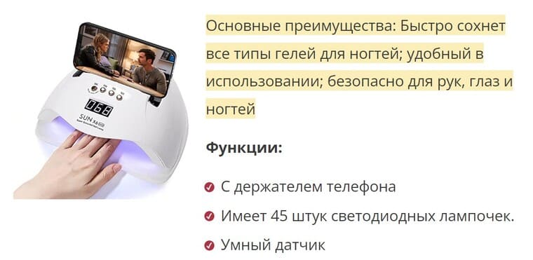Основные преимущества: эффективное рассеивание тепла; безопасно для глаз и рук или ног; быстро отвержает все типы светодиодных УФ-лаков для ногтей. Имеет вентиляционные отверстия, предотвращающие перегрев инструмента.