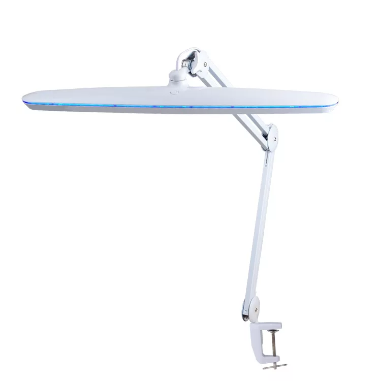 Бюджетная лампа с качественными светодиодами обладает мощностью 8 Вт и может служить до пяти лет. Фиксируется к столу на струбцине, плафон можно поворачивать в двух направлениях. Светильник не дает мерцаний, что предотвращает развитие усталости глаз при наращивании ресниц.