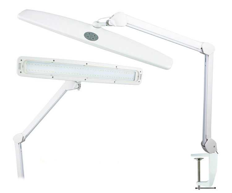 Лампа на струбцине обладает скромными габаритами, но хорошо освещает рабочую поверхность. Регулировать девайс можно по высоте и наклону. В процессе наращивания ресниц лампа не нагревается, яркий, но умеренный свет не раздражает глаза мастера или клиентки.