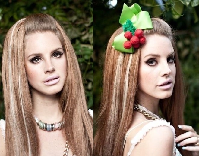 Однако кардинальные изменения во внешности певицы были сделаны не только хирургическим путем, но и вполне безопасными методами. Так, девушка превратилась из блондинки в медовую шатенку. Ее непослушные волны были тщательно накручены на крупные бигуди, так что получилась укладка в стиле золотого века Голливуда. Сейчас волосы Ланы Дель Рей стали более темными, почти черными и длинной уже гораздо ниже плеч. Кроме того, фирменный образ певицы включает также длинные наращенные ногти и огромные накладные ресницы.