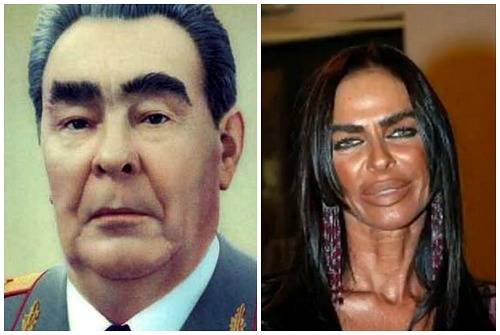 Штрихи к коллагеновому образу. Если вы окинете взглядом фото, на которых запечатлена Михаэла Романини, то подумаете, что перед вами обычный транссексуал. На вид она мужик-мужиком. Кроме огромного рта и резиновой кожи бросаются в глаза массивные черные брови. Обычно такой растительностью гордятся жгучие итальянцы, но Микаэла всячески с помощью макияжа пытается выделить эту, и без того внушительную часть своего образа. С помощью красок и гелей она расчесывает и укладывает свое сомнительное достоинство. Не капли не стесняясь, она любит зачесывать брови ко лбу. От этого создается эффект Леонида Брежнева.