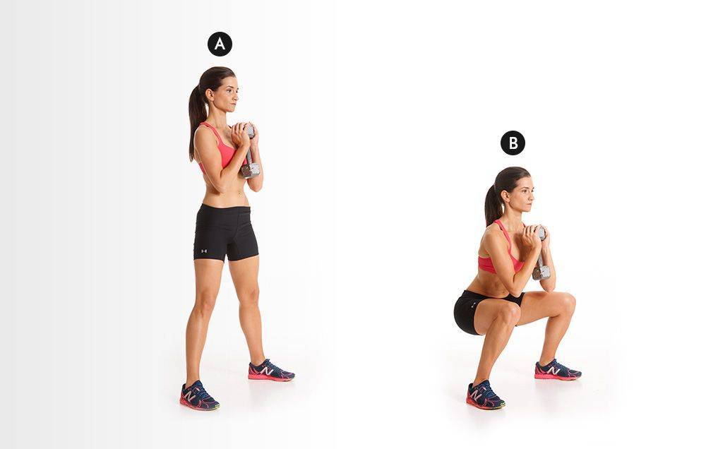Выполняются, как и обычные приседания. Только дополнительно взять посильные гантели в руки. Пятки отрывать нельзя. Опускаться необходимо до уровня, когда бедра окажутся горизонтальны полу. Количество подходов и повторений, как в предыдущем случае. Похудение обеспечивается за счет работы четырехглавой и ягодичной мышц, отвечающих за размеры ляшек.