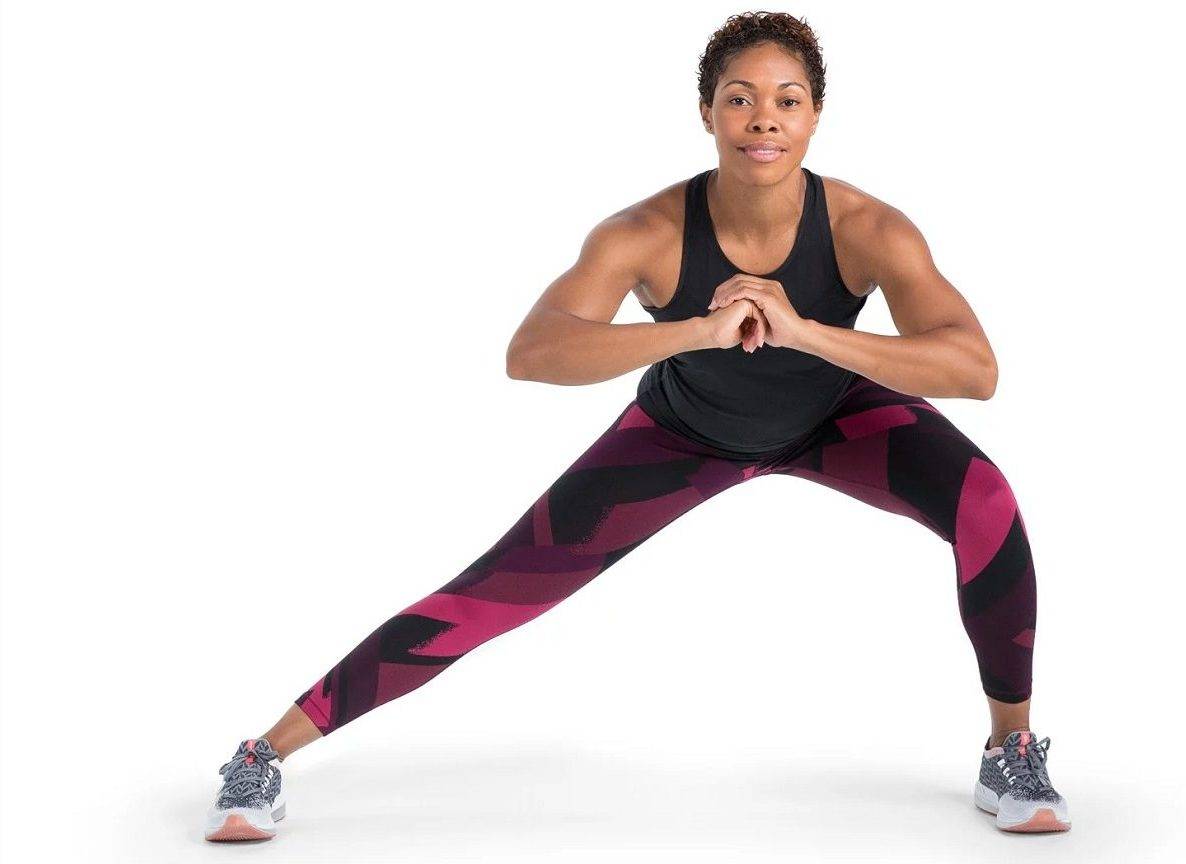 Это более сложный вид приседаний, который совершается с широко расставленными ногами и развернутыми стопами. Необходимо не только следить за техникой выполнения, но и держать баланс. Одно из лучших упражнений для похудения в бедрах.