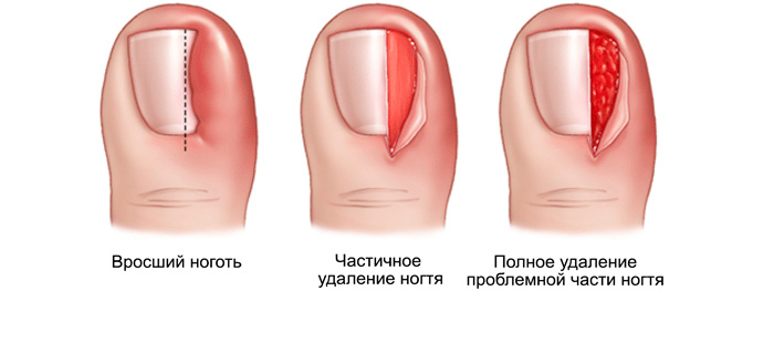 - Удаление вросшего ногтя — хирургическая операция, предполагающая резекцию ногтевой пластины (частично либо полностью), а также иссечение разросшихся тканей.
