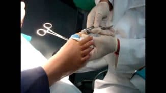 Заканчивается действие удалением и глубокой санацией, которой подвергается боковая стенка поврежденного пальца. Эту работу выполняет сканирующий лазер, скрупулезно подчищая очаги гнойных воспалений, буквально испаряя вросший участок ногтя, а вместе с ним и края корней его ложа.