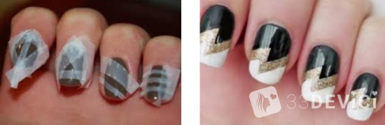 Идеи нежного маникюра легко реализовать – достаточно купить рулон малярного скотча выбранного цвета. Продается в магазинах нейл-арта самых разных цветов. С его помощью можно делать геометрические орнаменты, делить ноготь на зоны для росписи разными цветами. Простой маникюр с липкими полосками делается невероятно быстро и легко.