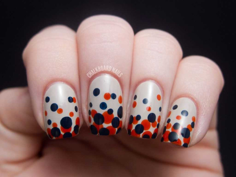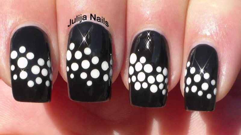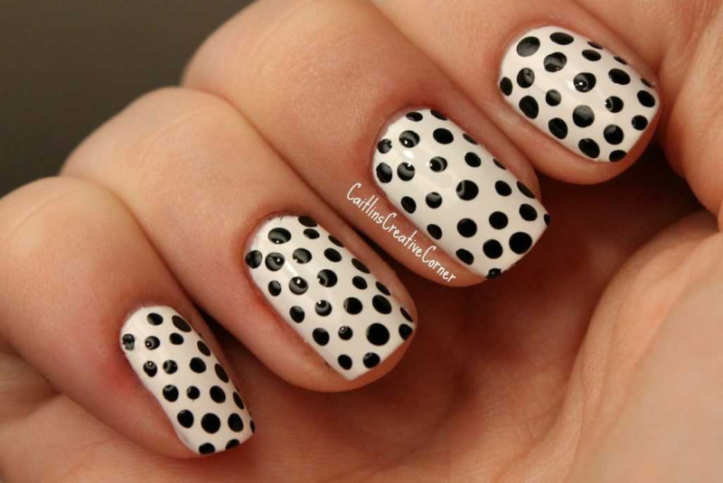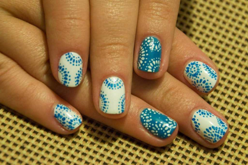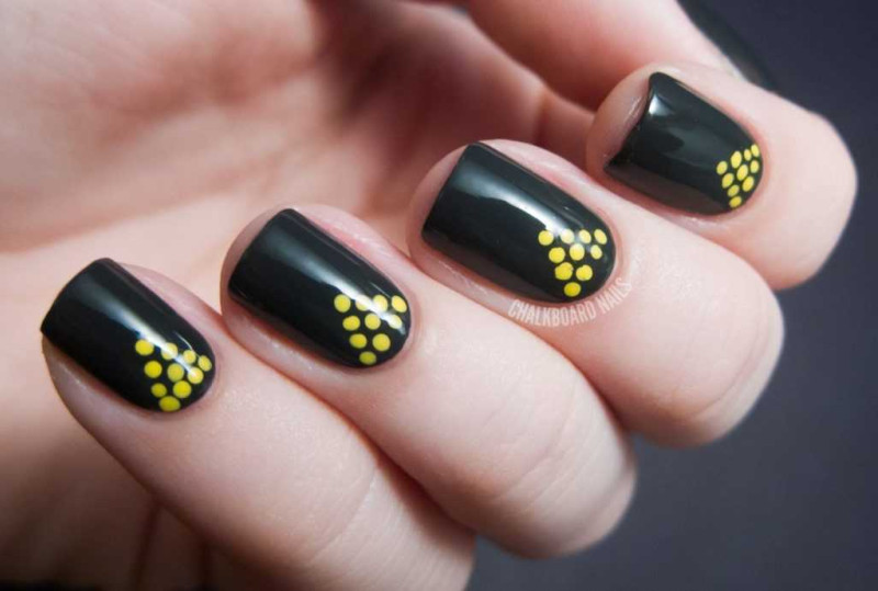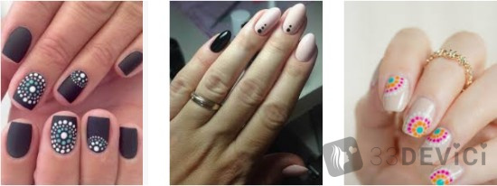 Проще всего сделать на ногтях точки, линии и другие геометрические фигуры. Они могут наноситься упорядочено или хаотично. В самом начале ноготь покрывается базовым цветом. После того, как слой лака подсохнет, при помощи кисточки рисуются линии, а иголкой можно нанести аккуратные точки.