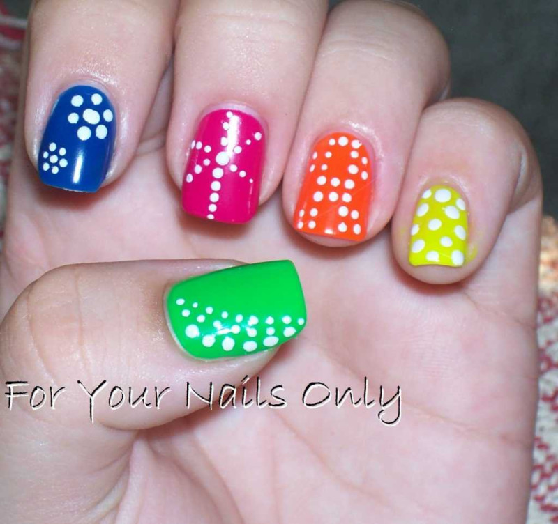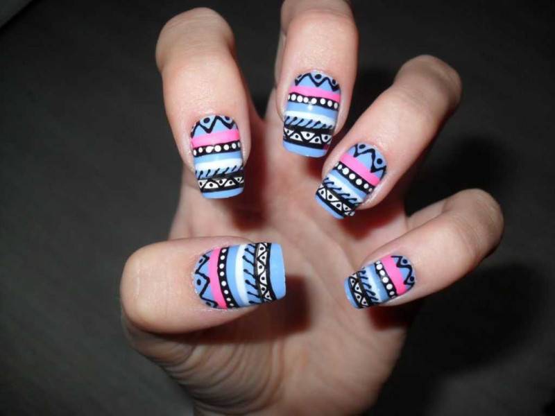 Если никаких декоративных материалов для маникюра у вас нет, но есть однотонные лаки других цветов, то можете экспериментировать и с ними. Например, накрасить один ноготь синим лаком, второй – голубым, третий – розовым и так дальше.