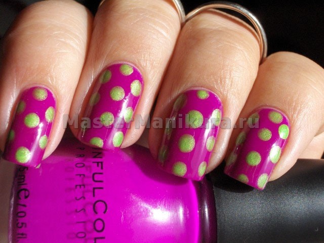 Покрывают ноготь ярким цветом, например, красным или черным. После полного высыхания первого слоя наносят лак другого оттенка точечной кистью. Обычно сочетают несколько цветов, тогда маникюр выглядит стильно и выразительно.
