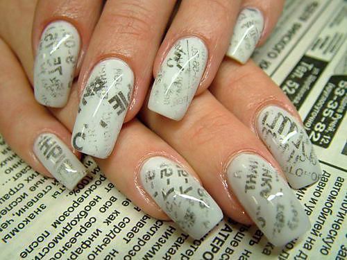 Газетный маникюр появился относительно недавно, но уже успел завоевать сердца модниц своей простотой и эффектностью. Метод создание маникюра: на ногти, с помощью спирта, переносится напечатанное изображение из газеты или других изданий.