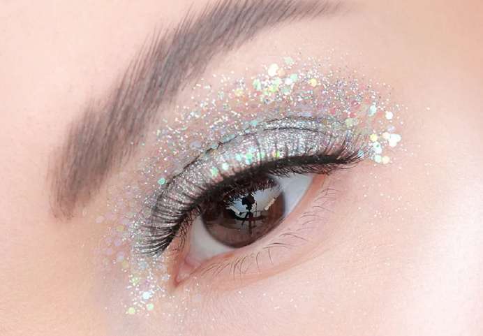 Легкий макияж кардинально преобразит глиттер. Россыпь мелких блесток на веках, как и на ногтях или волосах, привнесет в мейкап торжественные нотки и подойдет для вечера.