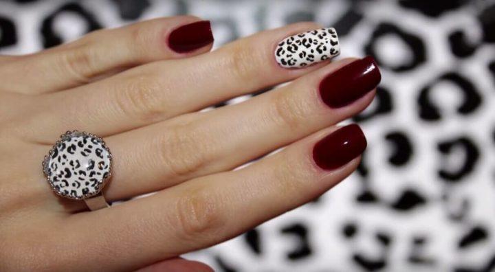 Для создания роскошного маникюра с хищным окрасом прекрасно подойдет шеллак. Так придать оригинальности повседневному образу можно, добавив акцентный леопардовый принт на один ноготь. Помимо классического сочетания с оттенками красного, он гармонично соседствует с кофейным, изумрудным, черным, синим.