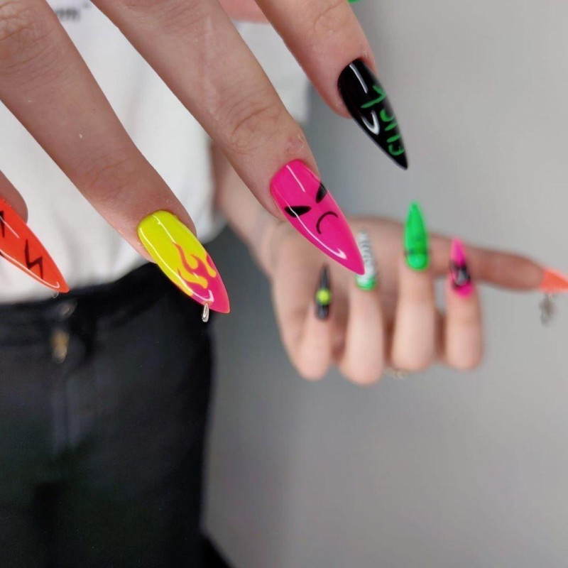 Неоновые и кислотные оттенки ногтей на лето будут самыми популярными и востребованными, позволяя создать супермодный летний маникюр в стиле френч, омбре, с цветами и полосками, негативным пространством и непременно с матовым топом.