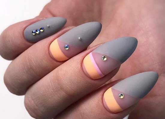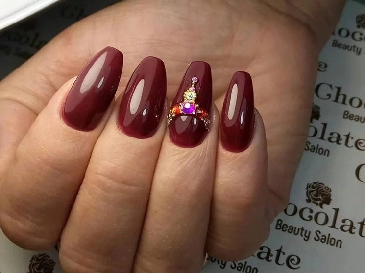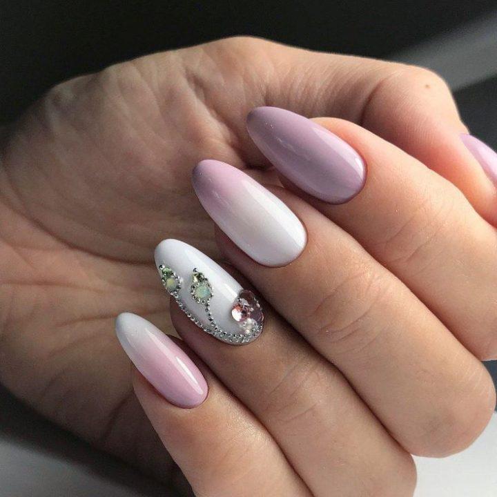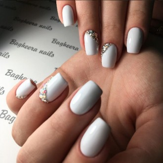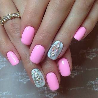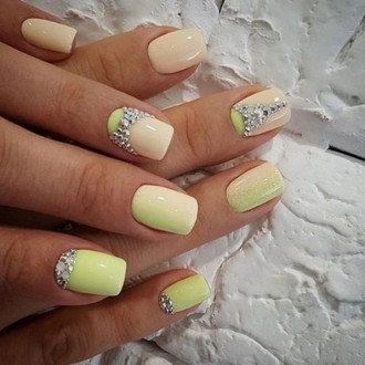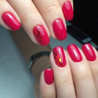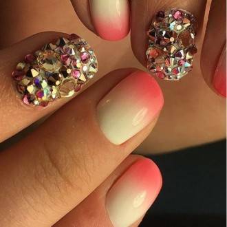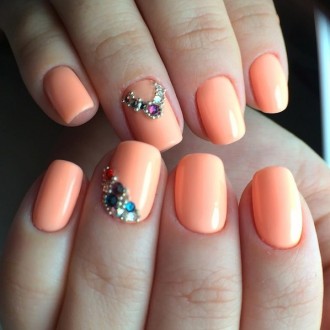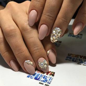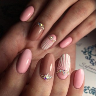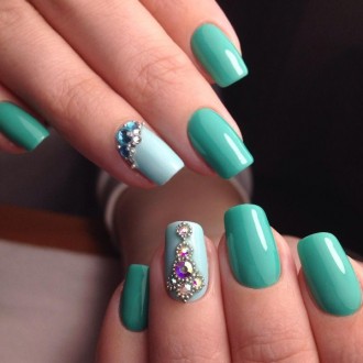 Ровные грани и яркий блеск имитируют драгоценность и делают ваши ногти по истине блестящими. Дизайн ногтей — это личное дело девушки, она подбирает свой стиль на основании собственных желаний. Используются камешки разной формы и размера. Каких-либо требований к цветовой гамме для ногтей нет. Модно будут выглядеть нежно-мятные и коралловые цвета.
