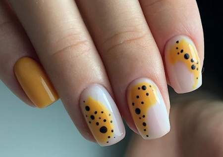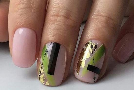 Абстрактный дизайн не сдает своих позиций. Такой маникюр всегда будет неповторимым. Даже если прийти к мастеру с конкретной идеей, повторить результат точь-в-точь с абстракцией получится вряд ли. Для создания маникюра можно использовать гель-лаки, краски, фольгу. Достаточно выбрать красивый оттенок гель-лака для фона, а с помощью контрастных цветов и кисти поставить на нем хаотичные разводы, мазки и кляксы.