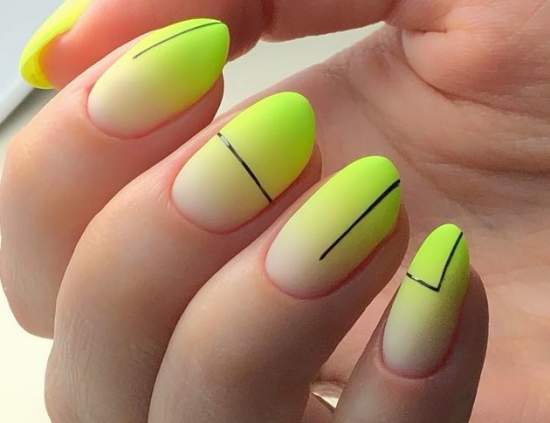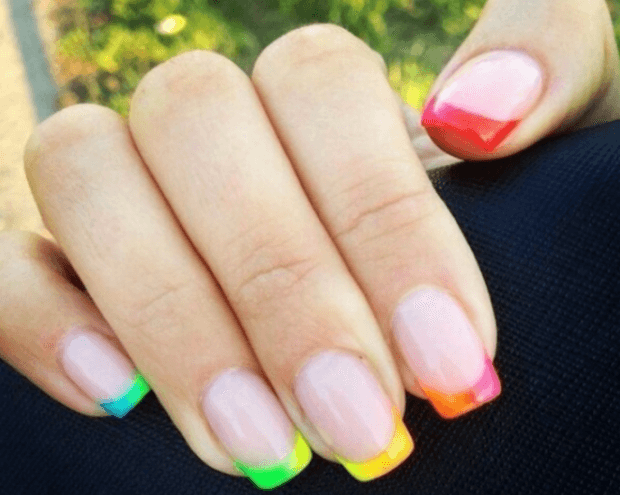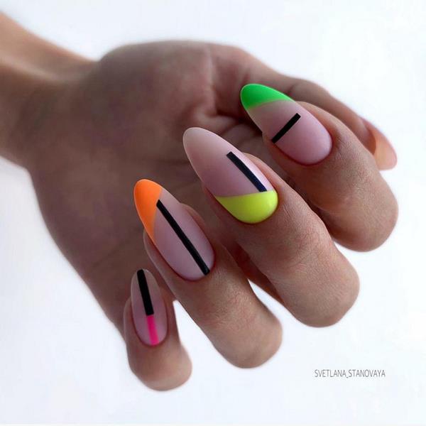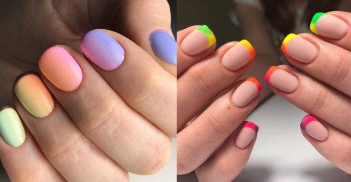 Неоновые и кислотные оттенки ногтей на лето будут самыми популярными и востребованными, позволяя создать супермодный летний маникюр в стиле френч, омбре, с цветами и полосками, негативным пространством и непременно с матовым топом.