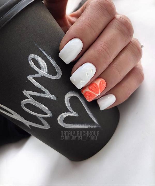 Симпатично смотрится белый маникюр на лето с акцентным дизайном на одном ноготке в виде рисунка или блесток, что придадут выразительность летнему маникюру, и сделают его более нарядным и интересным.