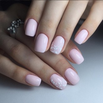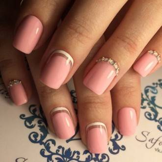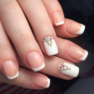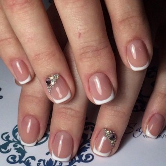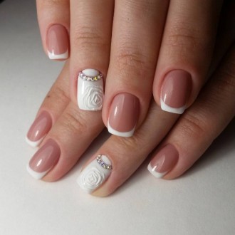 Для нежного образа невестам подойдут пастельные перламутровые тона. Сами по себе такие лаки являются броскими и не нуждаются в декорировании стразами и другими элементами. Самым популярным среди невест является французский маникюр. Однако в новом году актуальным будет френч с светло-розовым кончиком, задекорированный цветами