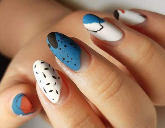 Модная абстракция в летнем дизайне ногтей придется по душе любительницам необыкновенного и неординарного стиля ноготков. Тенденция абстрактного дизайна ногтей на лето повстречается с яркими гель-лаками и матовым покрытием, что прелестно выглядит на коротких и длинных ноготочках различной формы.