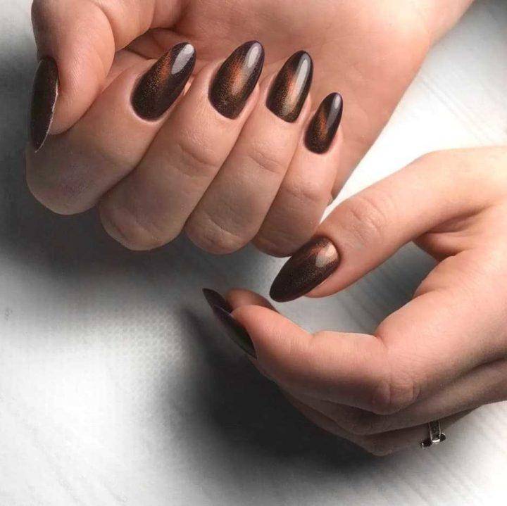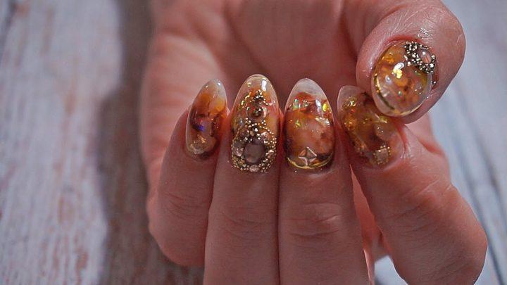 Янтарный вид маникюра красиво имитирует поверхность натурального камня. В красках используется темный, янтарный, коричневый, песочный, бежевый и черные тона. Краски дополняют один другого позволяя создавать потрясающую картину.