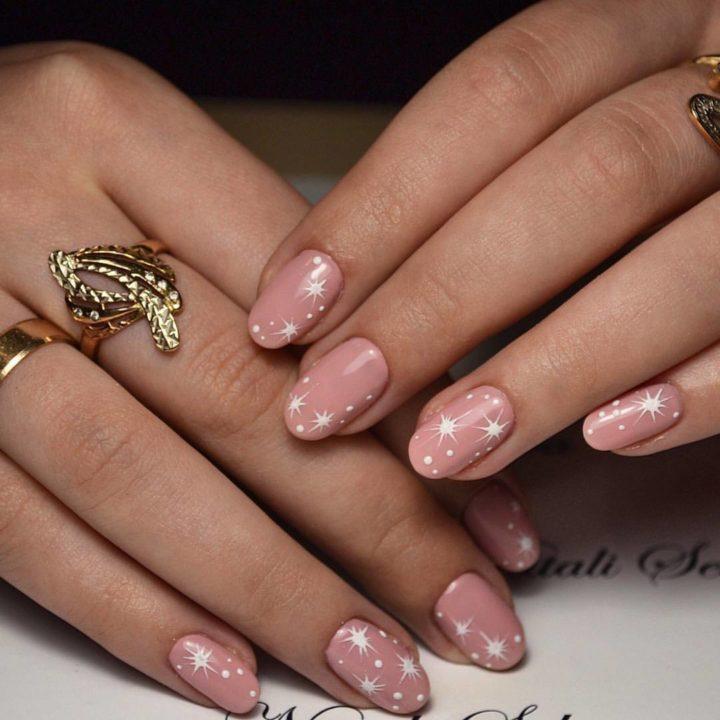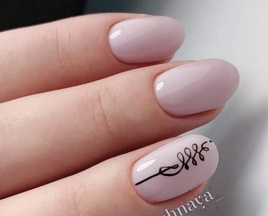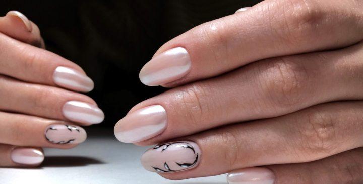 Нежный бежевый маникюр можно украсить рисунком белой краской «Паутинка». Такой дизайн в любое время года будет уместным. Он, как классический френч, подходит к любому наряду и случаю.