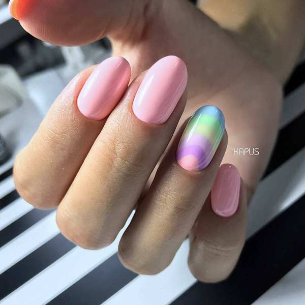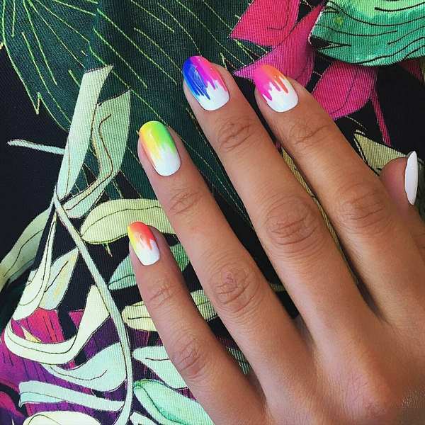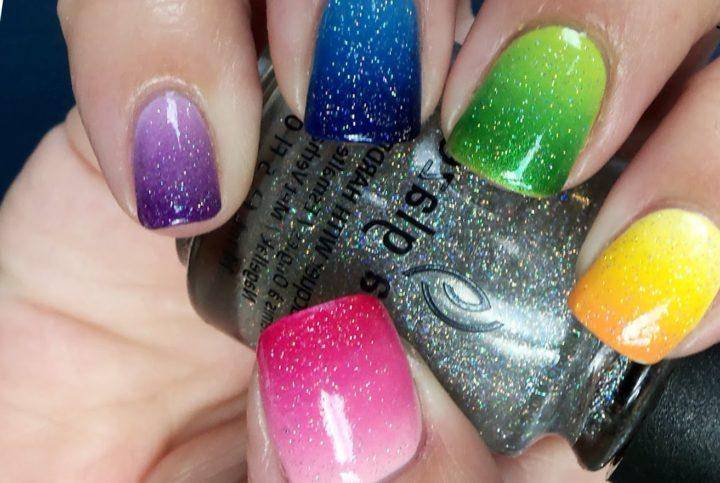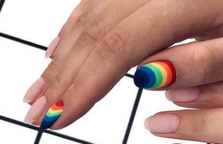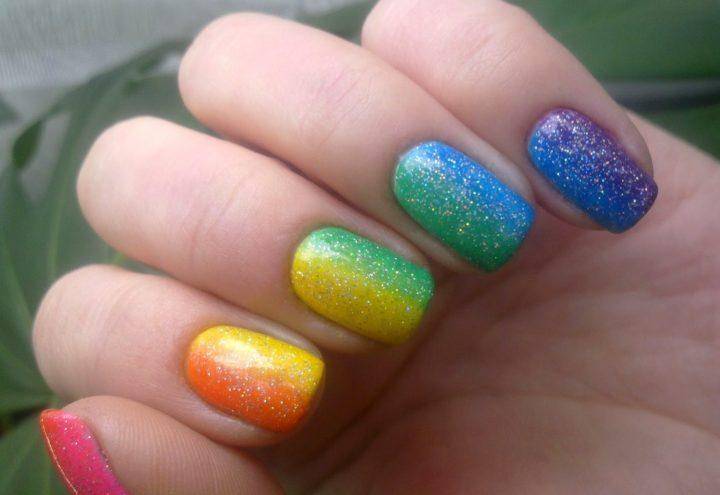 Маникюр радуга может исполнятся по-разному. В одном варианте — это радужный лак по всем ноготкам, где каждый цвет отличается друг от друга на один-два тона. В другом — это обмре или градиент.