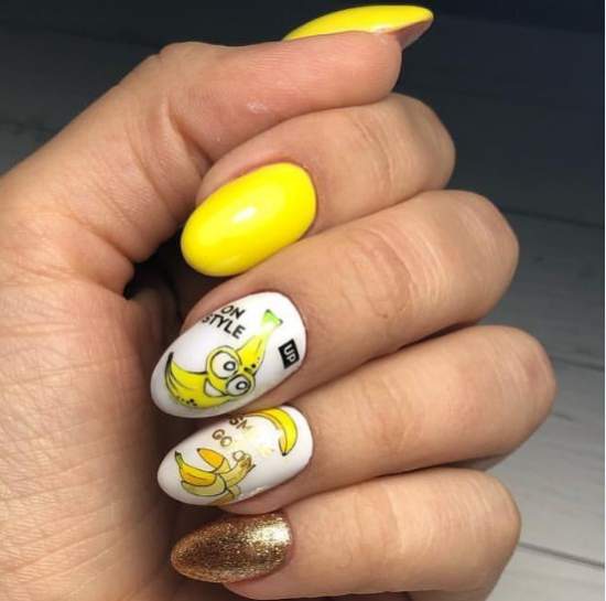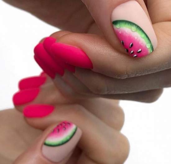 Как фрукты будут смотреться на ногтях девушки — полностью зависит от ее фантазии и решимости. Мы хотим лишь предложить некоторые идеи и озвучить тренды. Для такого стиля характерны яркие цвета. Стоит учесть, что после нанесения лака, ногти лучше покрасить защитным средством, так как краска дольше сохранит свою структуру. Изображения фруктов придают позитивного настроя и просто радуют глаз. Согласитесь, что при виде долек арбуза или киви невозможно не улыбнуться. Создать такой рисунок сможет любая девушка, даже не имеющая навыков в рисовании.