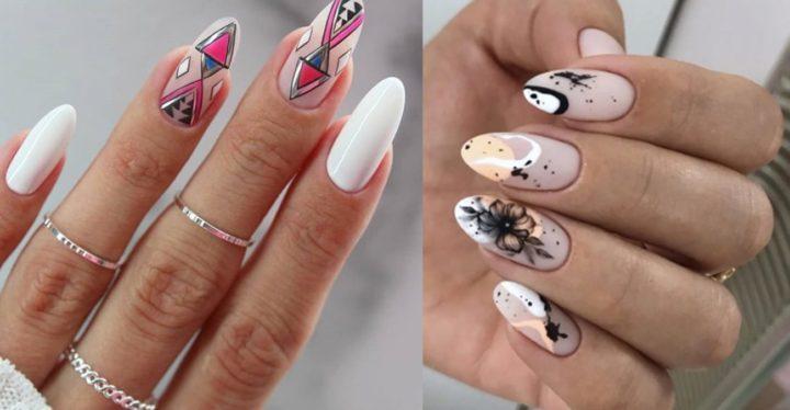 В летний период 2023 года на овальные ногти стоит подбирать уникальные и сложные рисунки. Это могут быть любые изображения природы, людей, мультяшки, флористика или узоры. Допускается обилие украшений, среди которых самыми популярными являются стразы, камни, блестки, глитер, шиммер и многое другое.