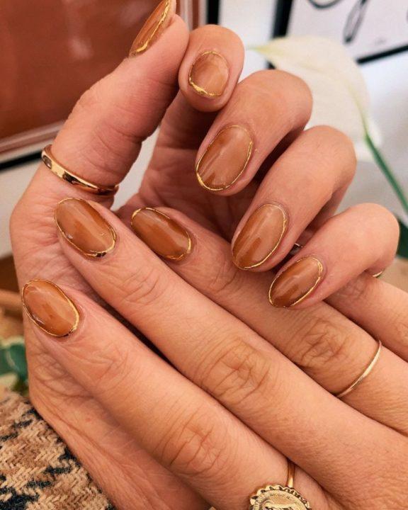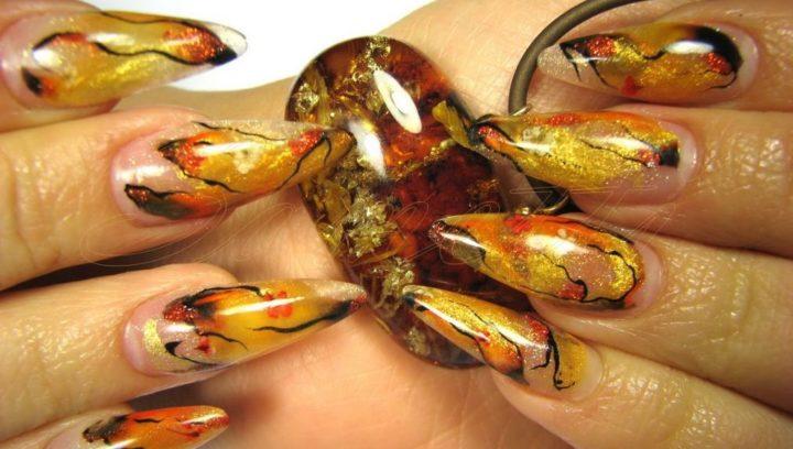 Янтарный вид маникюра подойдет на короткие, средние и длинные ногти, где в любом виде он будет смотреться превосходно. Часто вместе с янтарным видом мастера используют рамку. Рамка может быть из золота или серебра, что будет очень красиво дополнять янтарный дизайн.