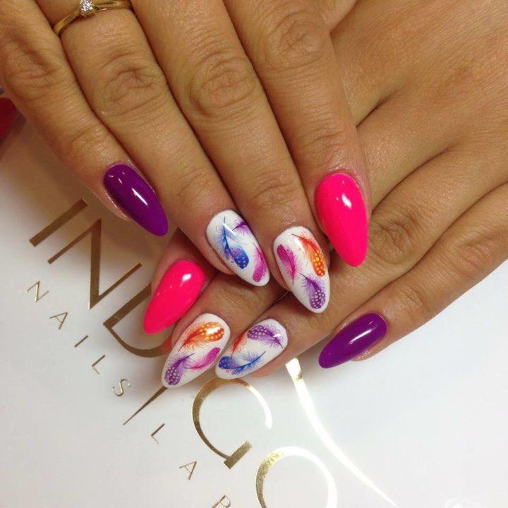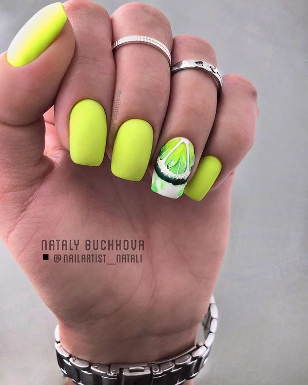 Любительницам лаконичных форм и простых дизайнов в геометрическом стиле в жаркие месяцы стоит добавить немного яркости на ногти. Бело-черные контрасты стоит оставить до холодного сезона, а сейчас попробуйте выполнить маникюр в оттенках лета – сочных и свежих.