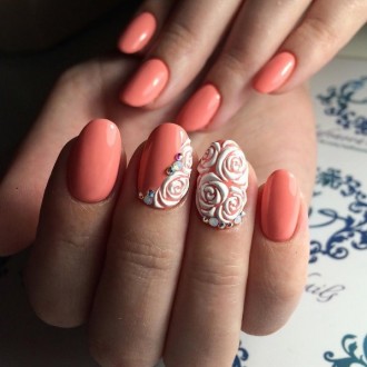 Он придаст вашим пальчикам изящности. Также вы можете добавить немного глиттера, чтобы создать мерцающий эффект. Тем не менее, не стоит нагружать ногти лишним декором и цветами из лепнины, которая, кстати, давно уже вышла из моды. К подвенечному платью прекрасно подойдет плотный белый лак, лунный маникюр с использованием нежно-розового и персикового цветов.