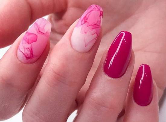 А в этой работе все модные тенденции 2021-2022 собраны на одних ноготках – трендовые цвета, матовое покрытие, “мраморный” дизайн. Сочетание очень удачное.