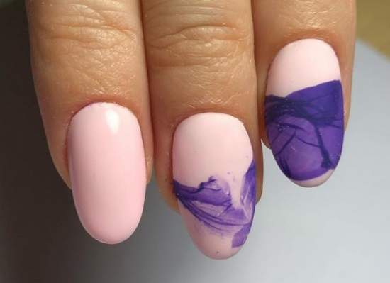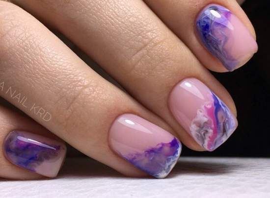Получить необычные формы и узоры можно с помощью техники «Вуаль». Летний дизайн ногтей позволяет использовать яркие оттенки гель-лаков как для подложки, так и для самой вуали. Красиво сочетается розовая, сиреневая, синяя вуаль с белым, светло-розовым и персиковым цветом фона.