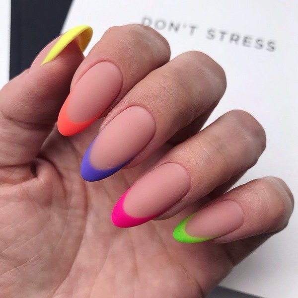 Разноцветный матовый френч с яркими «улыбками», французский маникюр с неоновыми «улыбками», а также красочный летний френч с акцентом на отдельных ноготках – это горячие тренды французского маникюра на лето 2024.