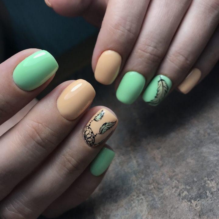 Мятные оттенки, сочетание матового и глянцевого покрытий, уместная инкрустация – залог трендового маникюра. Идея, которой обязательно стоит воспользоваться.