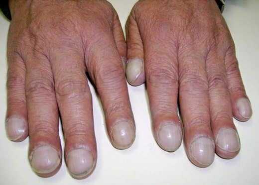 Часто подобное поражение называется «Ногти Гиппократа». Заключается оно в том, что ногтевая пластина становится округлой формы, сильно выпуклой и увеличивается в размерах.