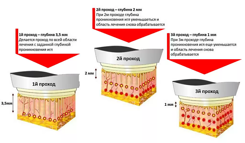 Этот вид лифтинга делают под местной анестезией. Врач воздействует на кожу лица клиента радиоволновой энергией, проникающей на глубину до 3,5 мм. Это делается с помощью одноразового картриджа с иглами.