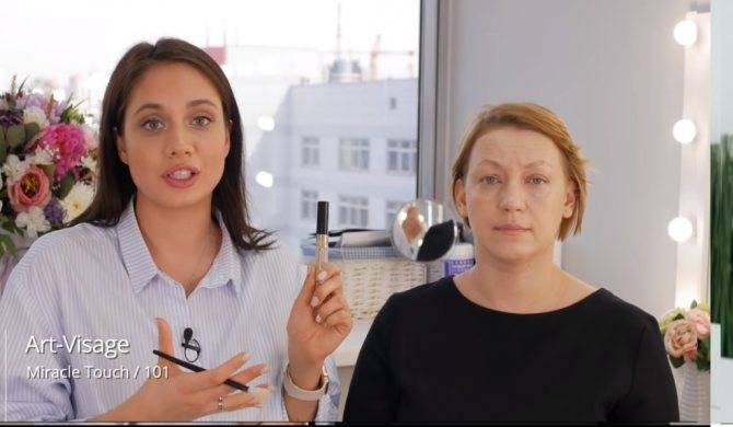 Далее нужно нанести консилер от Art-Visage – Miracle Touch. Перенести средство на дерму можно при помощи кисти, но тушевать все же лучше пальцами. Благодаря теплу тела, продукт слегка нагревается и дает более равномерное покрытие. Этим же продуктом следует проработать зону носогубных складок.