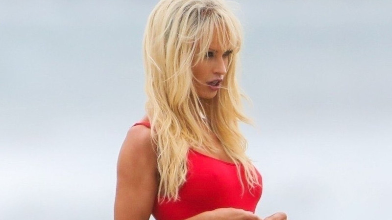 В очередной съемочный день она продемонстрировала головокружительную фигуру в знаменитом красном закрытом купальнике, став точной копией своего прототипа. В свое время Андерсон заявляла, что по-прежнему хранит у себя дома тот-самый-легендарный-пляжный-образ, и спустя тридцать лет сидит он на ней прекрасно.