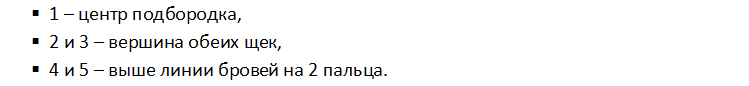 - Область скул – от подбородка по направлению к вискам и от верхней губы к мочке.