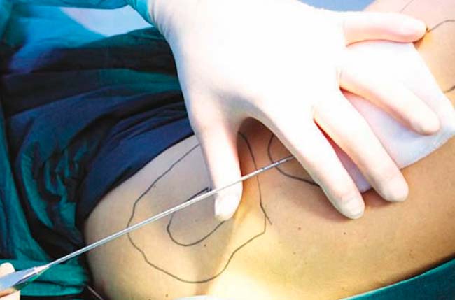 Проводится с использованием канюли – полой иглы, что соединяется с трубкой и вакуумным аппаратом. Вначале делают 1.5 см надрез, далее вставляют канюлю и благодаря ей разрушают адипоциты. Вакуумом производят откачку содержимого клеток по трубке. При операции используется общий либо местный наркоз.