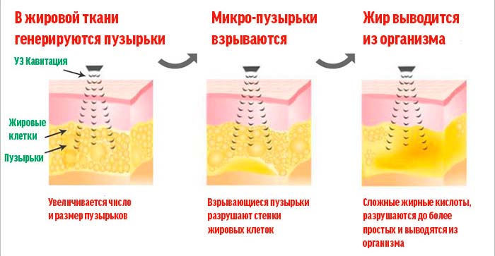 Кавитация относится к доступным техникам липолиза. Пластика живота проводится УЗ излучением, которое обеспечивает: